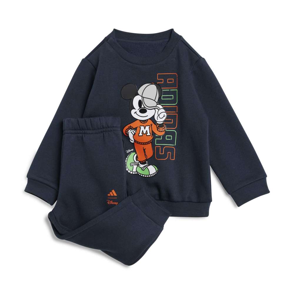 Questo completo Adidas, composto da felpa girocollo e jogger, combina la morbidezza del tessuto felpato con dettagli ispirati a Disney, come la stampa luminescente di Topolino sulla parte superiore. I pantaloni, dotati di girovita elasticizzato, garantiscono una vestizione semplice e confortevole, mentre la felpa assicura calore e libertà di movimento, ideale per i primi passi del bambino. Un capo che coniuga funzionalità e stile per i più piccoli.