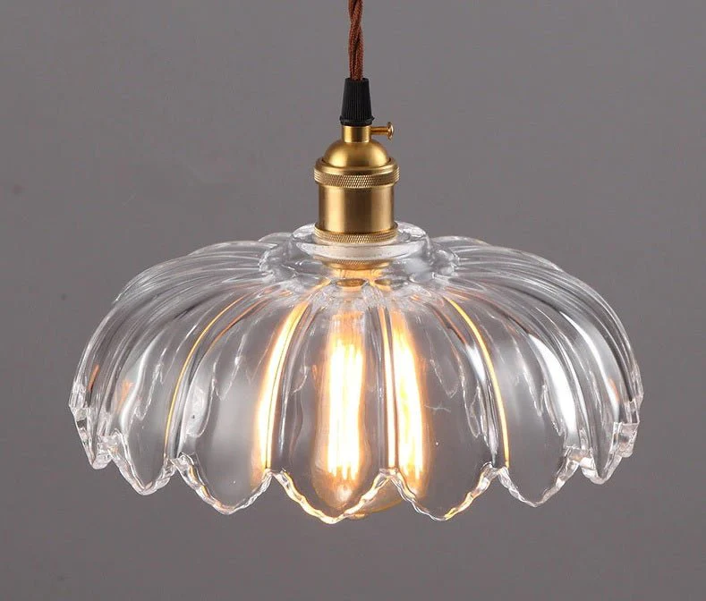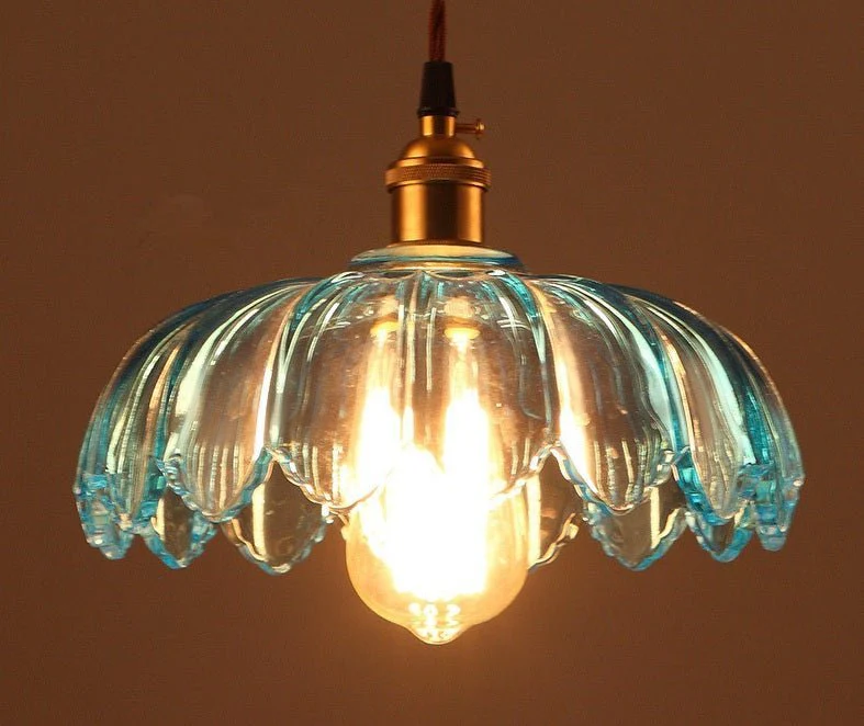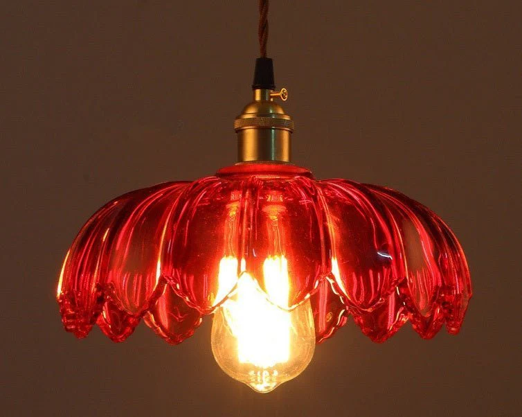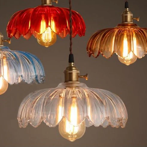Lámpara de techo con un diseño similar al de una flor el cual aporta un toque romántico. Este modelo iluminado presenta un vidrio rayado colorido con un acabado brillante, ideal para hostelería.