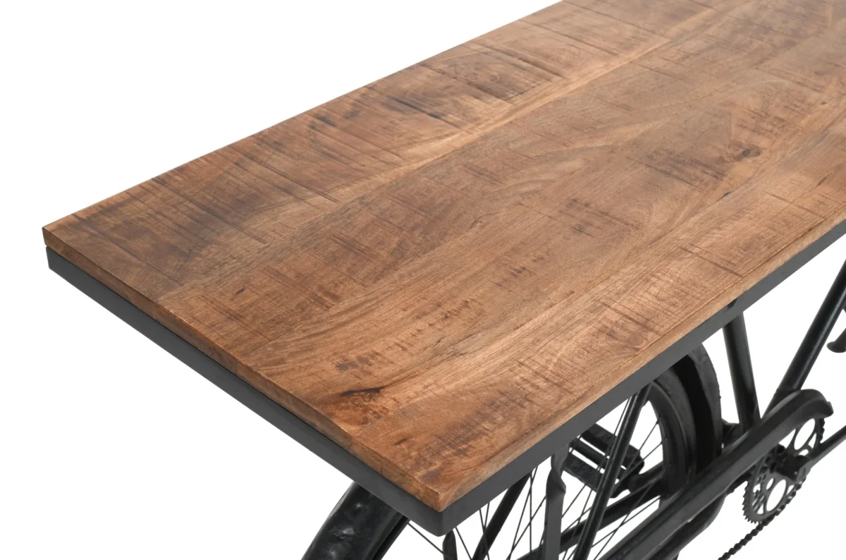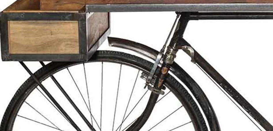 La mesa consola bicicleta vintage es una pieza de decoración única que combina diseño industrial, reciclaje creativo y carácter artesanal. Está fabricada con un tablero de madera maciza apoyado sobre la estructura de una bicicleta vintage real, creando un mueble original y lleno de personalidad.