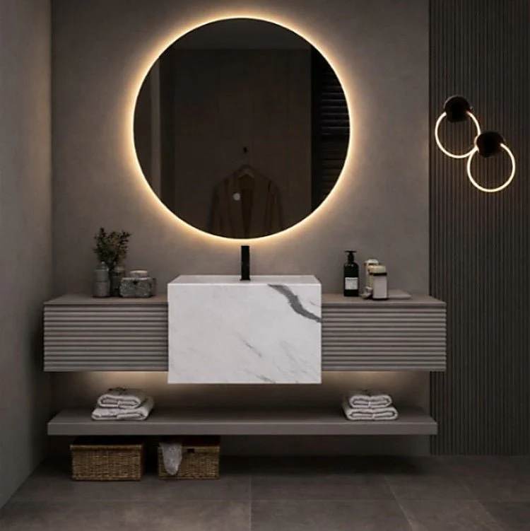 El lavabo está fabricado en piedra sinterizada con vetas decorativas, por lo que cada pieza es única. La intensidad, forma y dirección de las vetas pueden variar respecto a las imágenes mostradas en la web. Estas variaciones forman parte de las características del material y no se consideran defectos de fabricación.