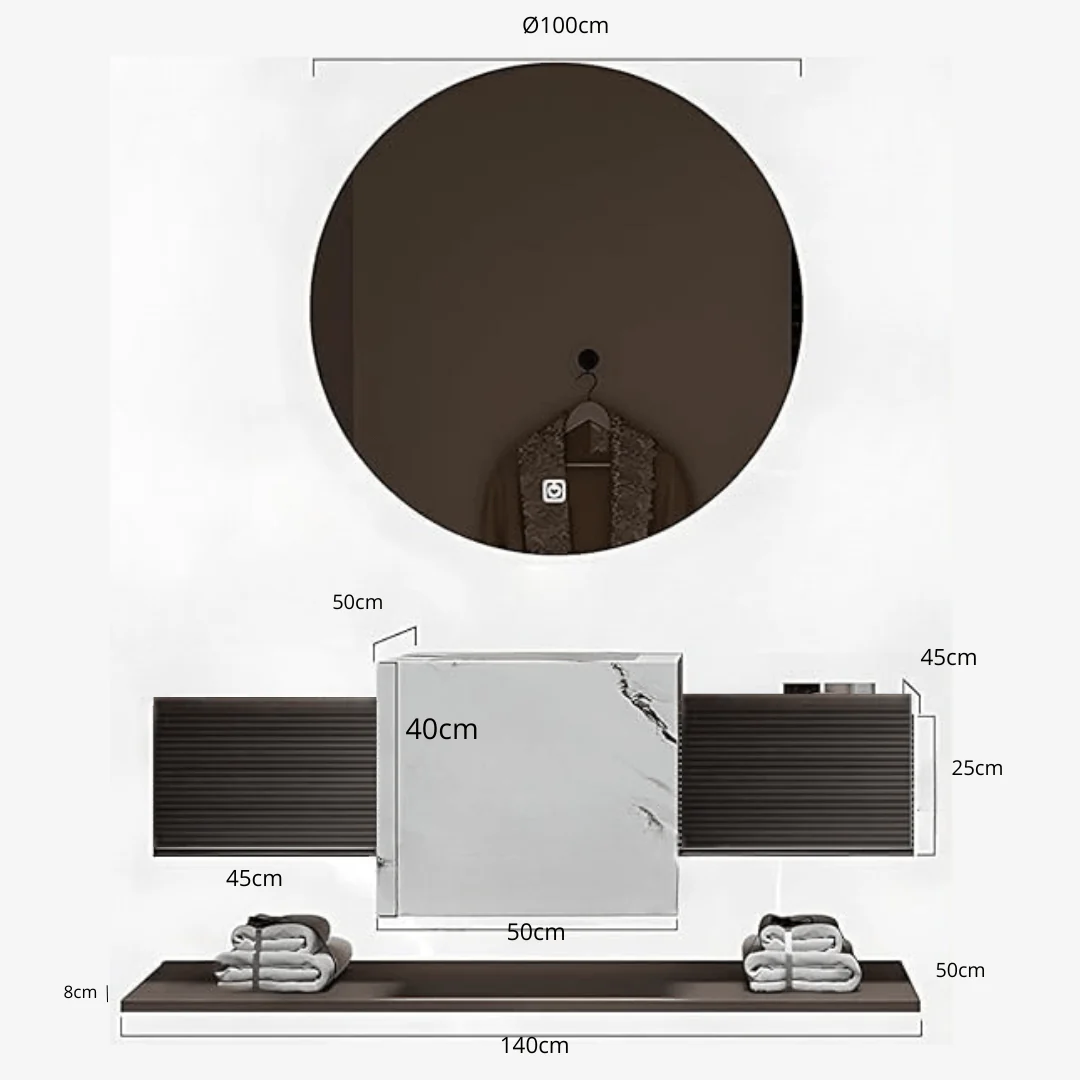 El mueble de baño Mimo 140 cm con lavabo y espejo LED es un conjunto moderno diseñado para aportar funcionalidad y estilo al baño. Incluye lavabo central en piedra sinterizada, dos cajones laterales con cierre suave y estante inferior, ofreciendo una solución completa de almacenamiento para baños contemporáneos.