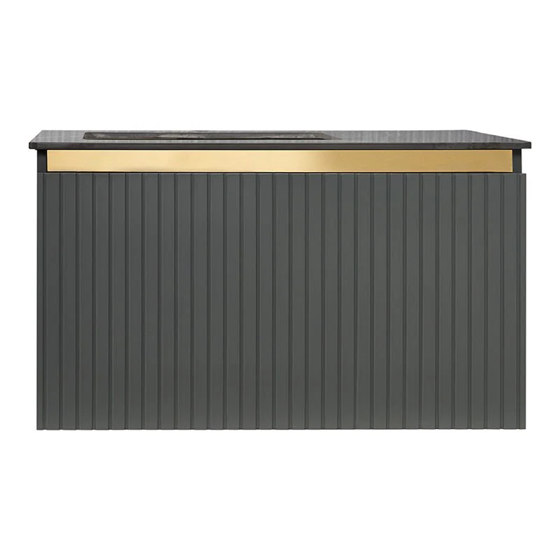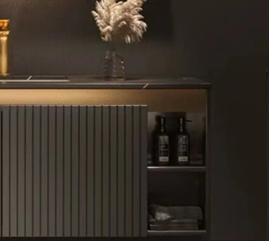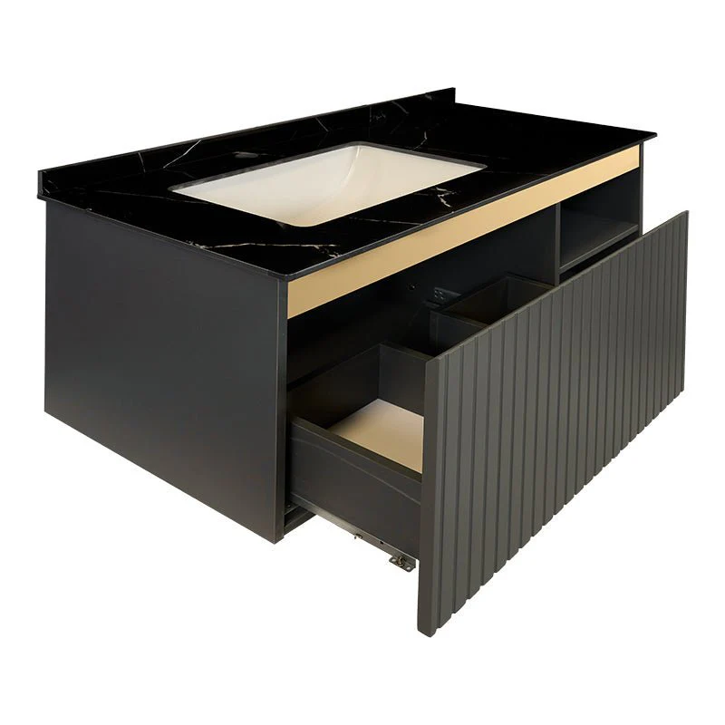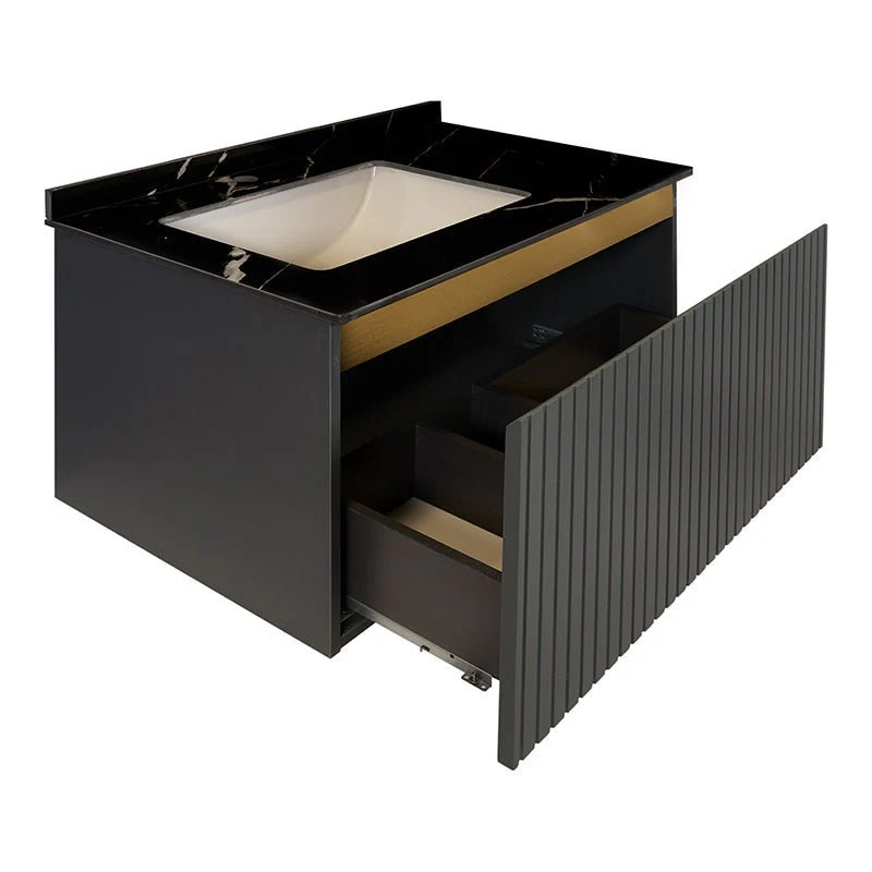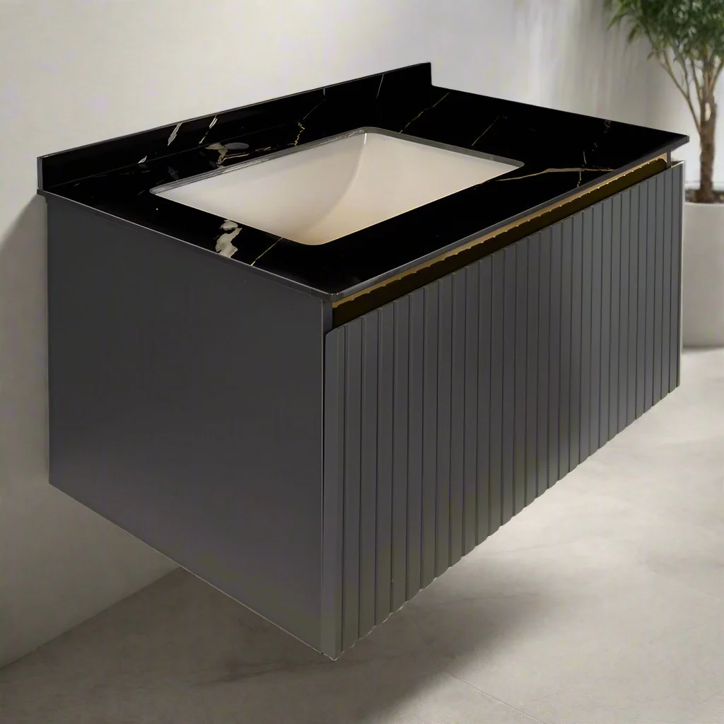 El Mueble de baño suspendido presenta un diseño moderno y sofisticado. Está fabricado en plywood gris grafito, un material duradero y elegante. La encimera de piedra natural color negro con veteado blanco añade un toque de lujo, y el lavabo incorporado de cerámica se integra a la perfección en el conjunto.