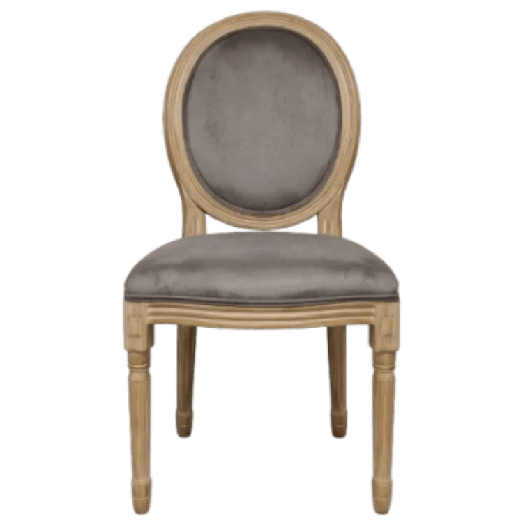 El tejido de terciopelo taupe complementa perfectamente el encanto clásico de las sillas, agregando un toque de modernidad y versatilidad. El respaldo en forma de medallón, añade un aire de lujo y sofisticación.