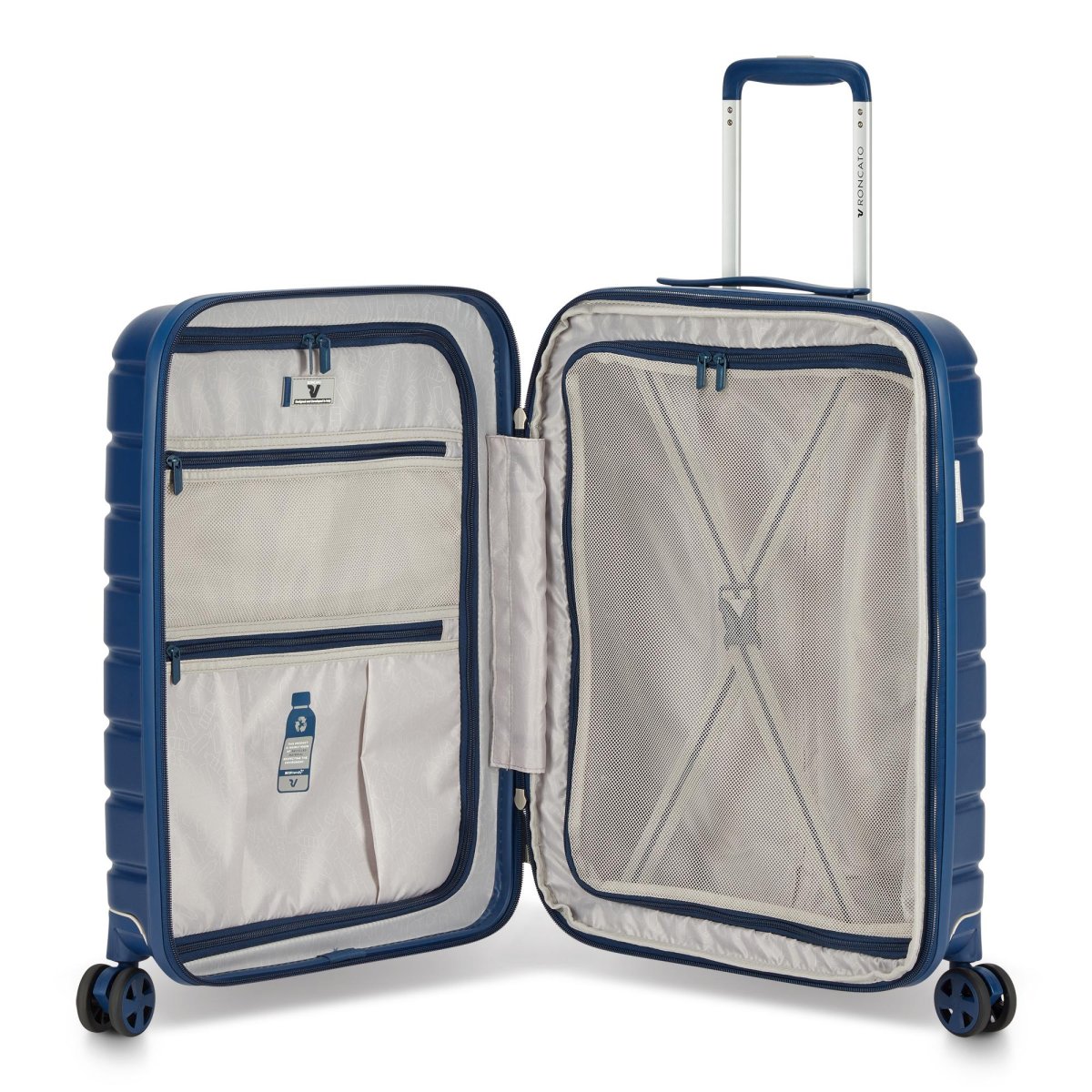 La collezione Relife si compone di 3 trolley (grande, medio, cabina) a 4 ruote. I gusci e la fodera sono realizzati in RPET, materiale realizzato derivante da bottiglie riciclate, a dimostrazione dell’impegno di Valigeria Roncato per la salvaguardia del nostro pianeta. Il nome Relife, infatti, vuole indicare il concetto, che ci sta particolarmente a cuore, di ridare vita a materiali che altrimenti sarebbero rimasti non utilizzati. Così facendo invece stiamo contribuemndo a ridure gli sprechi. La collezione si presenta in varie, accattivanti combinazioni colore, con ruote doppie piroettanti e removibili, che offrono al prodotto maggior stabilità e manovrabilità e consentono, inoltre, di avere maggior capacità di carico al trolley, essendo appunto staccabili. Togliendo la ruota al momento del check-in, la misura del trolley in altezza diventa come quella di qualsiasi altro bagaglio cabina. Le ruote possono essere rimosse anche per evitare rotture durante il trasporto in aereo e riposte in un comodo astuccio. L’interno si compone di due ampi comparti dotati di divisori e cinghie con chiusura a scatto con le quali fissare facilmente vestiti e scarpe. Un dettaglio da evidenziare: il porta indirizzo realizzato in sughero.