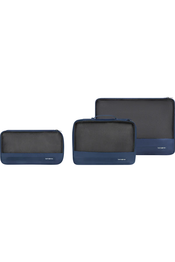 Set di 3 packing cubes, in tre diverse misure (S, M & L). Leggeri e compatti, sono facili da riporre quando non vengono utilizzati.