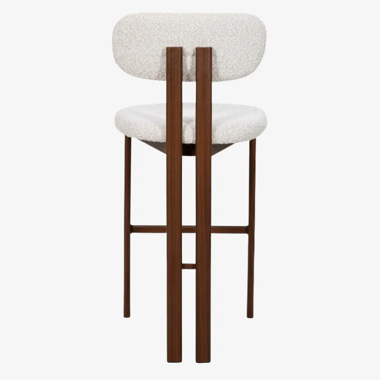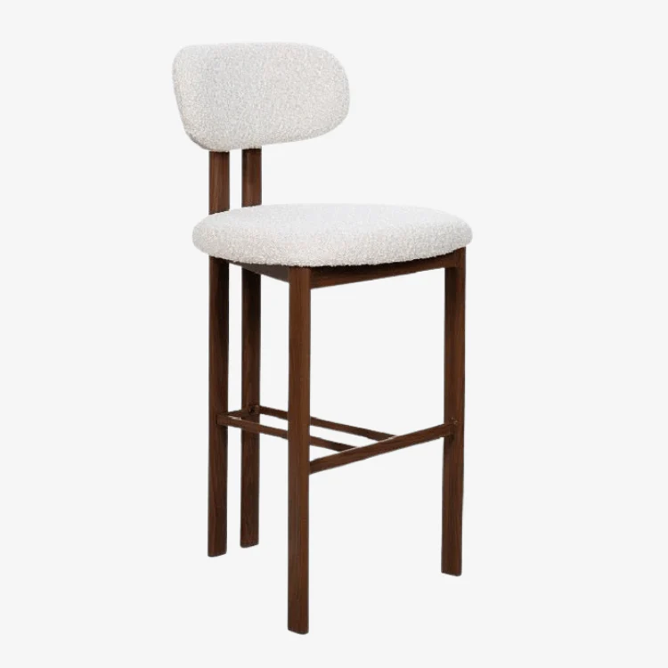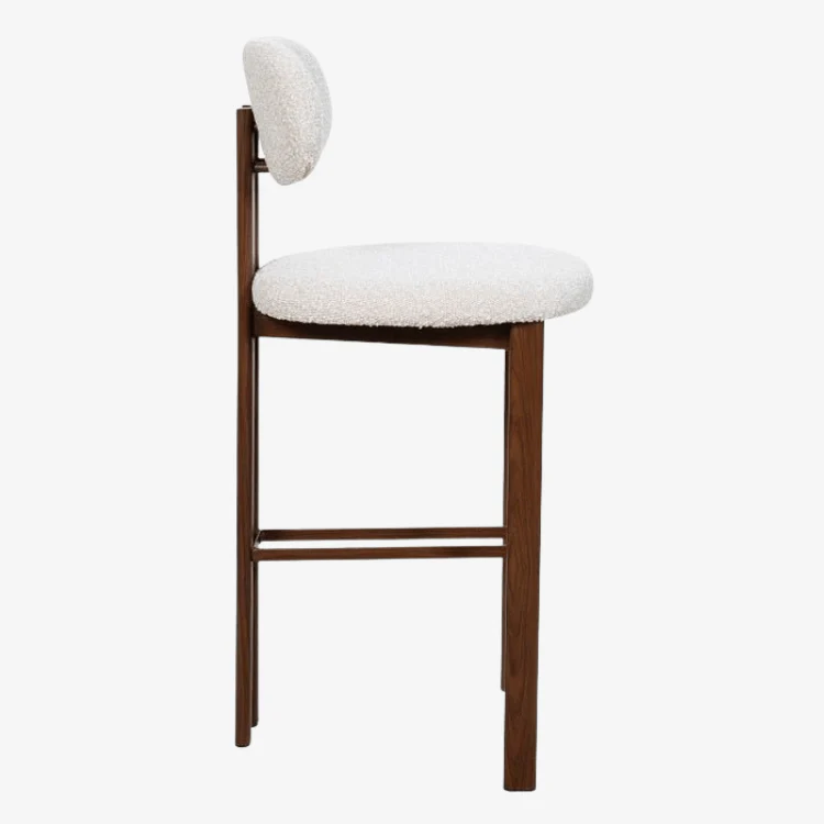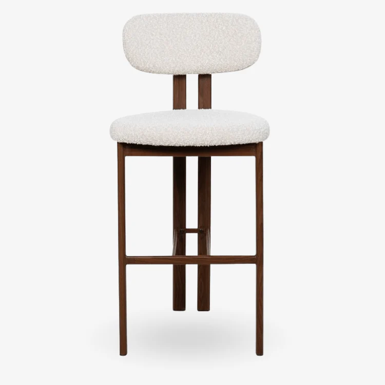 El asiento está tapizado con un tejido bouclé de hilos con nudos, de tonalidad neutra beige, que ofrece un acabado suave y lujoso. Este material de alta calidad garantiza durabilidad y comodidad, convirtiéndolo en la elección perfecta para cualquier ambiente, ya sea en tu hogar, restaurante o bar.
